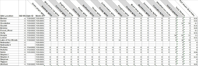 The drier, but still warm, weather expected next week may increase aphid flights. As small grains continue to dry and harvest increases, look for increased numbers of small grain aphids moving to alternate crops to finish their season. We tend to have our biggest aphid flights in early August, and while this week's capture was behind the 13 year average, our PVY Vector Risk Index values remain on that average track.